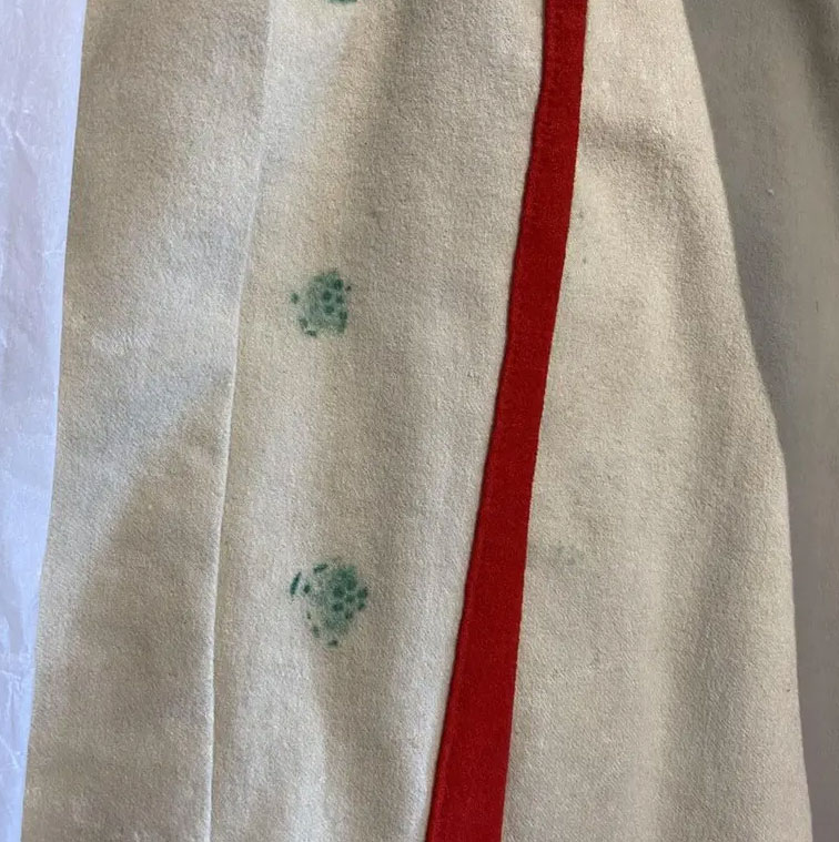 The military uniforms all required conservation treatment to enable them to be safely and pleasingly displayed. At the back of the uniform jacket, verdigris had badly stained the ivory-coloured fabric.